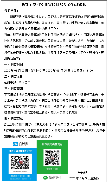 在公司層領(lǐng)導(dǎo)的帶領(lǐng)下,特力康人員紛紛解囊,小到幾十上百,大到數(shù)千,錢不分多寡,截止3月6日,結(jié)合特力康公積金捐助,共計捐款十萬元整。這都是特力康人在力所能及范圍內(nèi)對抗擊疫情的默默支持,是對有困難群眾的守望相助。充分發(fā)揚團(tuán)結(jié)互助精神,攜手并肩,眾志成城,凝聚起抗擊疫情的堅定信心和強(qiáng)大力量,用另一種方式陪伴一線抗疫醫(yī)務(wù)人員和疫情患者一起戰(zhàn)勝病魔。