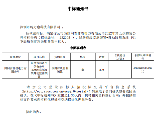 經(jīng)依法招標,確定我司(深圳特力康)為國網(wǎng)吉林省電力有限公司2022年第五次物資公開招標采購(招標編號: 232205 ),線路在線監(jiān)測裝置-舞動監(jiān)測系統(tǒng)包1下表所列事項采購貨物中標人。中標通知如下: