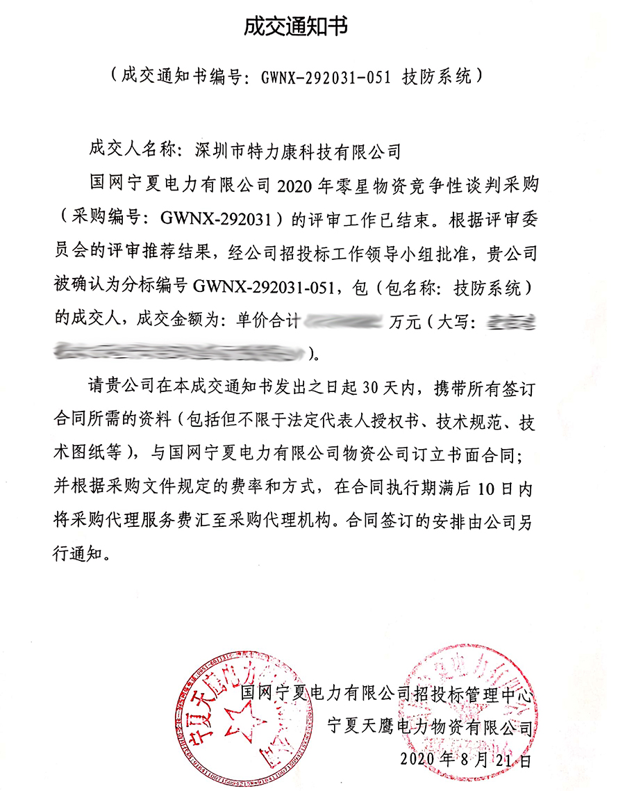 國網(wǎng)寧夏電力有限公司2020年零星物資競(jìng)爭(zhēng)性談判采購(采購編號(hào): GWNX-292031)的評(píng)審工作已結(jié)束。根據(jù)評(píng)審委員會(huì)的評(píng)審?fù)扑]結(jié)果,經(jīng)招投標(biāo)工作領(lǐng)導(dǎo)小組批準(zhǔn),我司(深圳市特力康科技有限公司)被確認(rèn)為分標(biāo)編號(hào)GWNX-292031-047,包(包名稱:配網(wǎng)防護(hù)設(shè)施-報(bào)警裝置)及分標(biāo)編號(hào)GWNX-292031-051,包(包名稱:技防系統(tǒng))的成交人,現(xiàn)發(fā)布成交通知書如下: