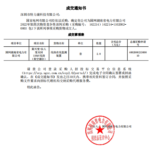 深圳市特力康科技有限公司:國(guó)家電網(wǎng)有限公司經(jīng)依法采購,確定你公司為國(guó)網(wǎng)湖南省電力有限公司2022年第四次物資競(jìng)爭(zhēng)性談判采購(采購編號(hào): 162214) 162214-1102002-0003包1下表所列事項(xiàng)采購貨物成交人。中標(biāo)通知如下: